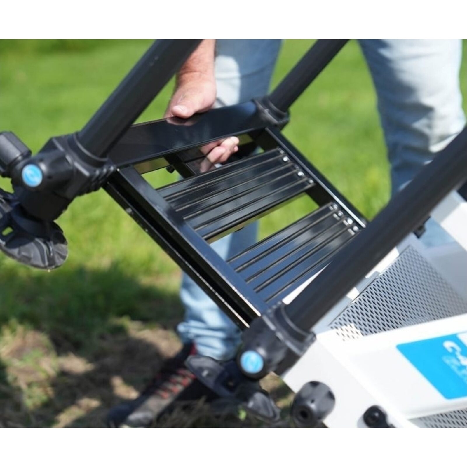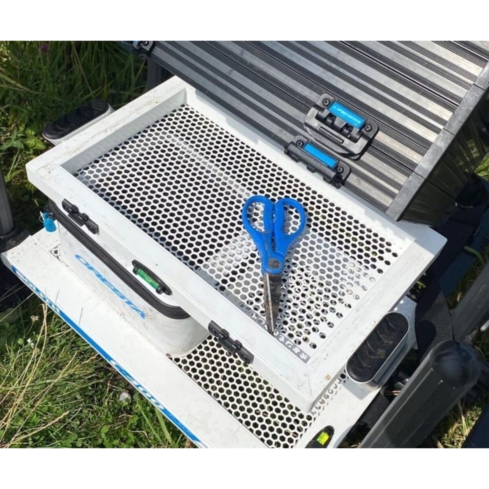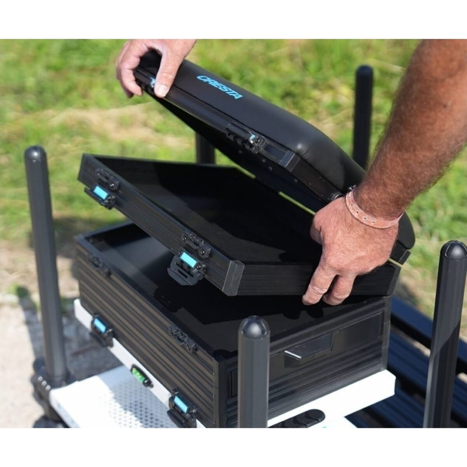 De Solith C400 is uitgerust met een zacht zitkussen en een stevige vulling voor langdurig comfort. Onder de zitting vind je een handig opbergvak voor tuigen en dobbers, terwijl een zijlade en twee voorladen met magneetsloten extra opbergruimte bieden. Het aluminium frame is niet alleen stevig maar ook lichtgewicht, met een traploos verstelbare voetplaat die laag bij de grond kan worden geplaatst. De Ø 36mm poten, waarvan vier telescopisch, zorgen voor stabiliteit op elke ondergrond. Dankzij het 360º non-marking systeem blijven de poten stevig op hun plek zonder sporen achter te laten.