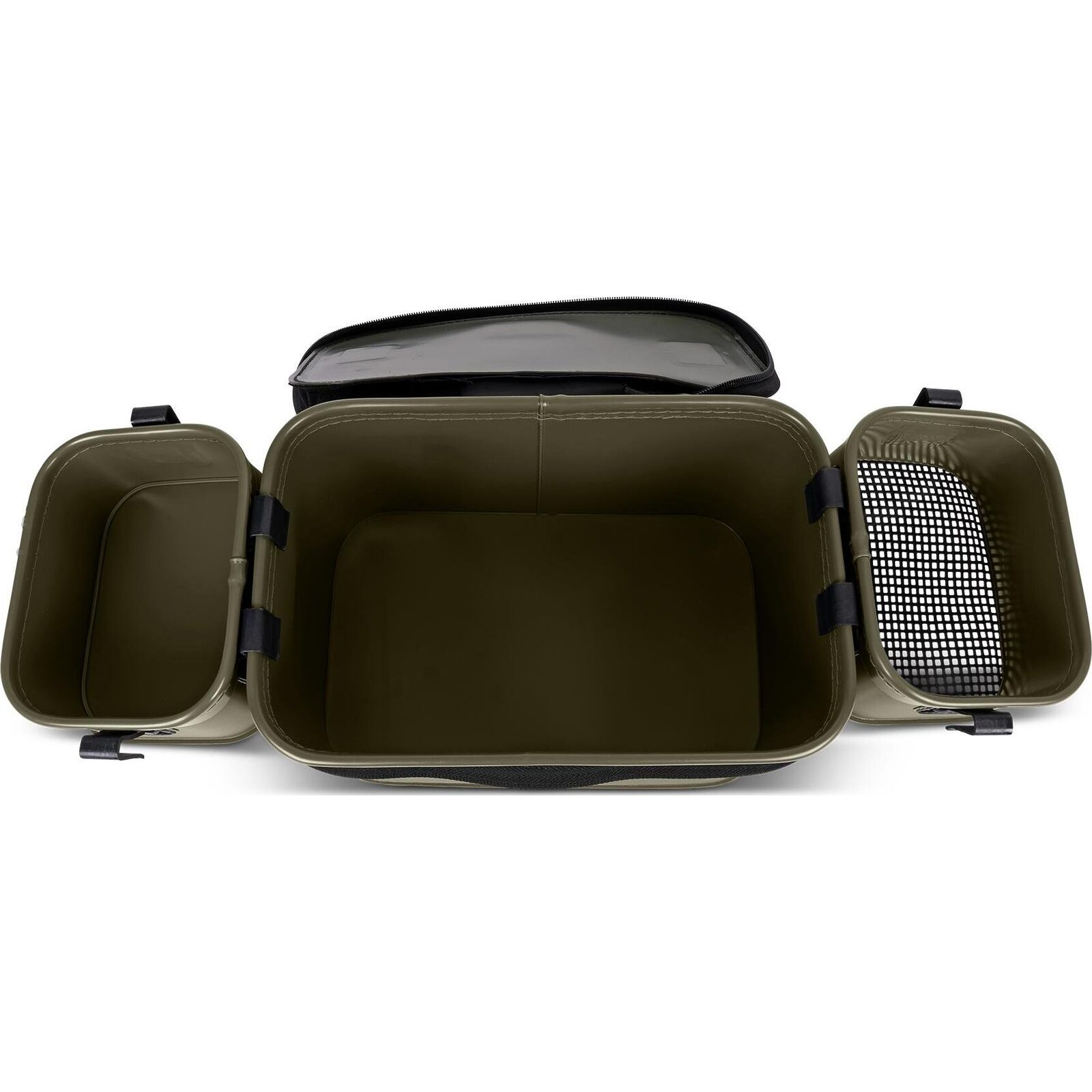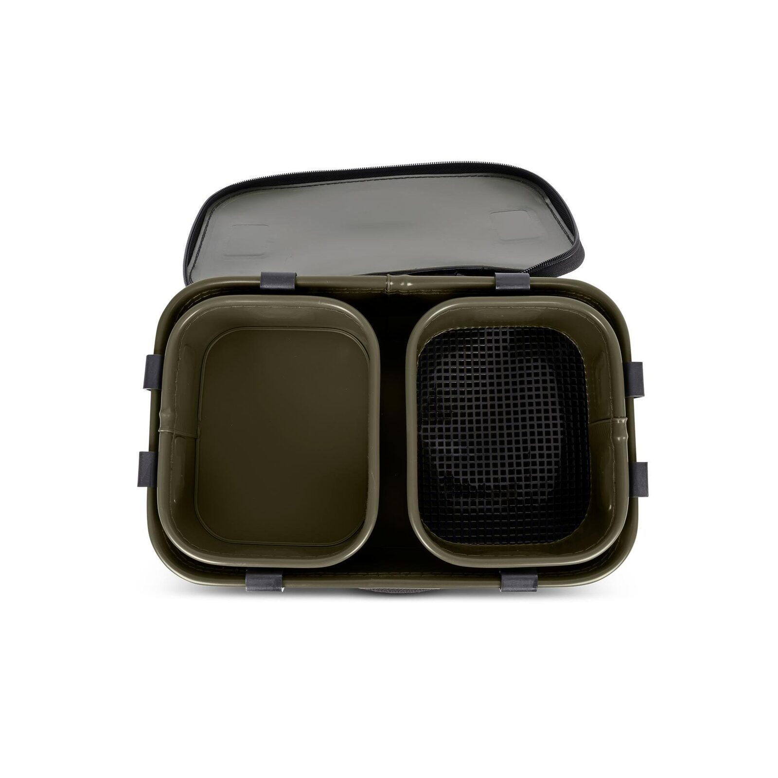 Het Korum Eva Bait Station komt met twee interne trays, waarvan één voorzien is van een 3mm gaas. Dit gaas is ideaal voor het doorzeven van natuurlijk aas en grondaas. Tijdens het vissen kun je de trays aan de buitenkant van de tas vastklikken, waardoor je een grote werkruimte creëert. Onder de trays is er voldoende ruimte voor je aasdozen en ander aas. De bait station is gemaakt van 100% EVA-materiaal, wat zorgt voor een duurzame en waterdichte opbergoplossing.