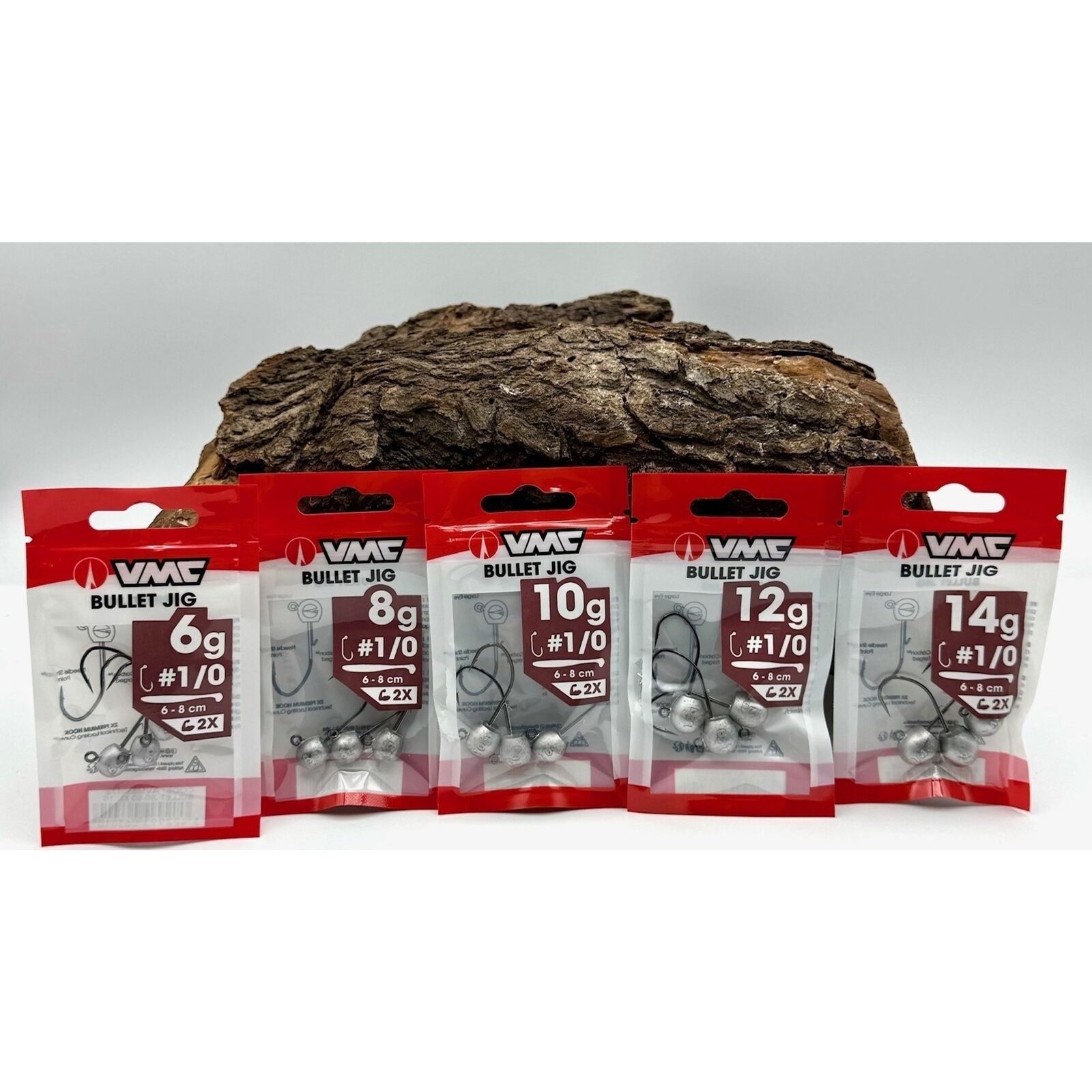 De Bullet Jig heeft als basis de sterke (2x premium) en scherpe VMC jighaak met baitholder om de shads goed op zijn plaats te houden en een extra groot oog voor maximale bewegingsvrijheid.